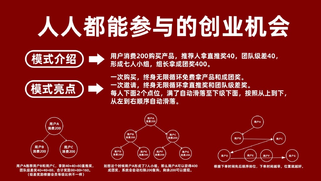 3、每人下面2个点位,占位满了系统自动向下滑落(从上到下,从左到右),相当于自己上面领导厉害,自己不邀请也可以成团,团队一条线公排简单粗暴。(自动滑落上下互帮)